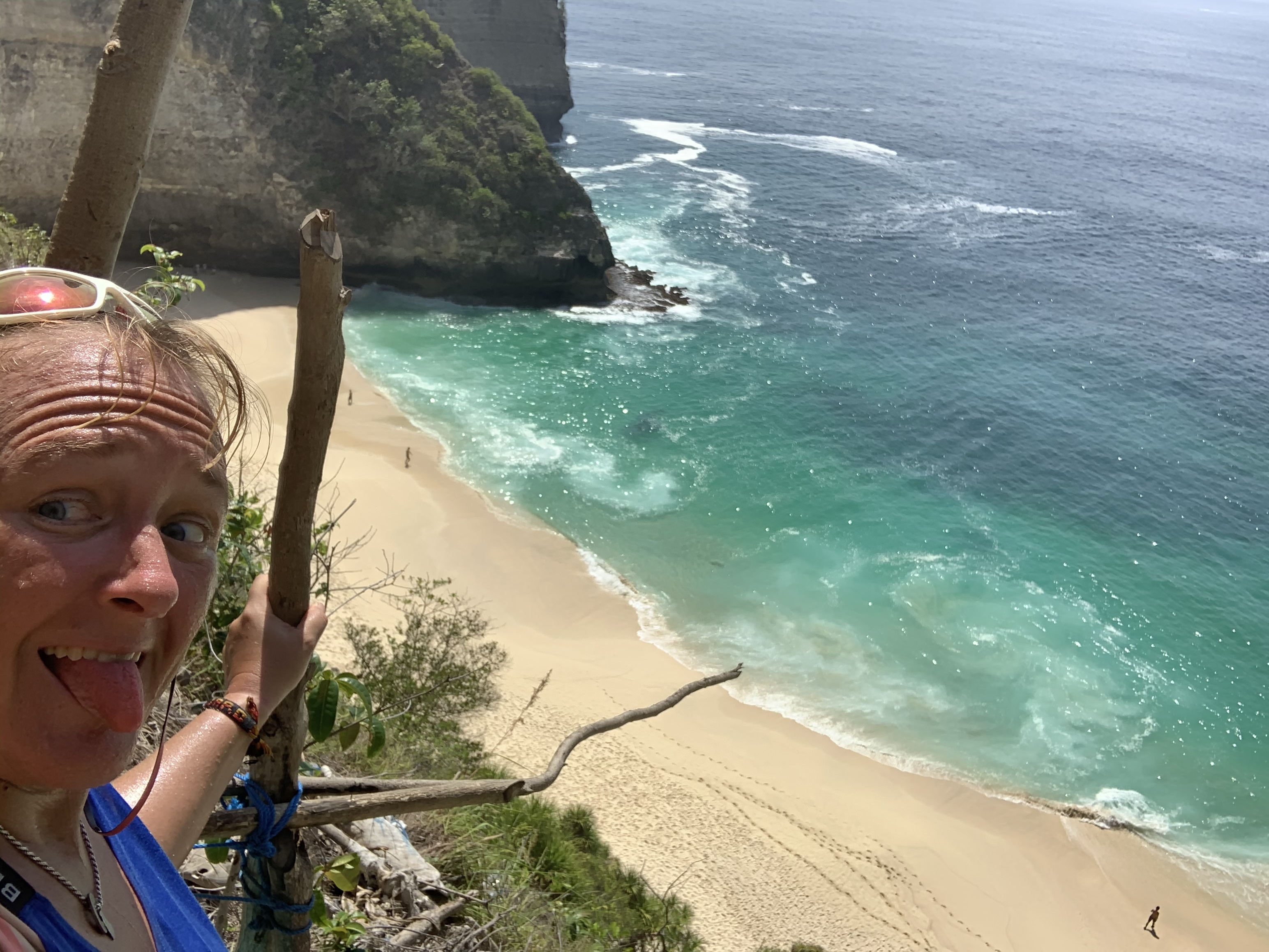 Only a handful of tourists braved the steep stairs down to the midway viewpoint & then it got real dicy, like straight out of a “what not to do on a vaca list” in Nusa Penida Island off the coast of Bali. Jagged rocks & handrails led an 85% straight drop down the cliff side to this picturesque beach out of a fairytale. Fear. Exhilaration. Risk. Excitement. All these emotions battling & of course I had to emerse myself in this big feat.
