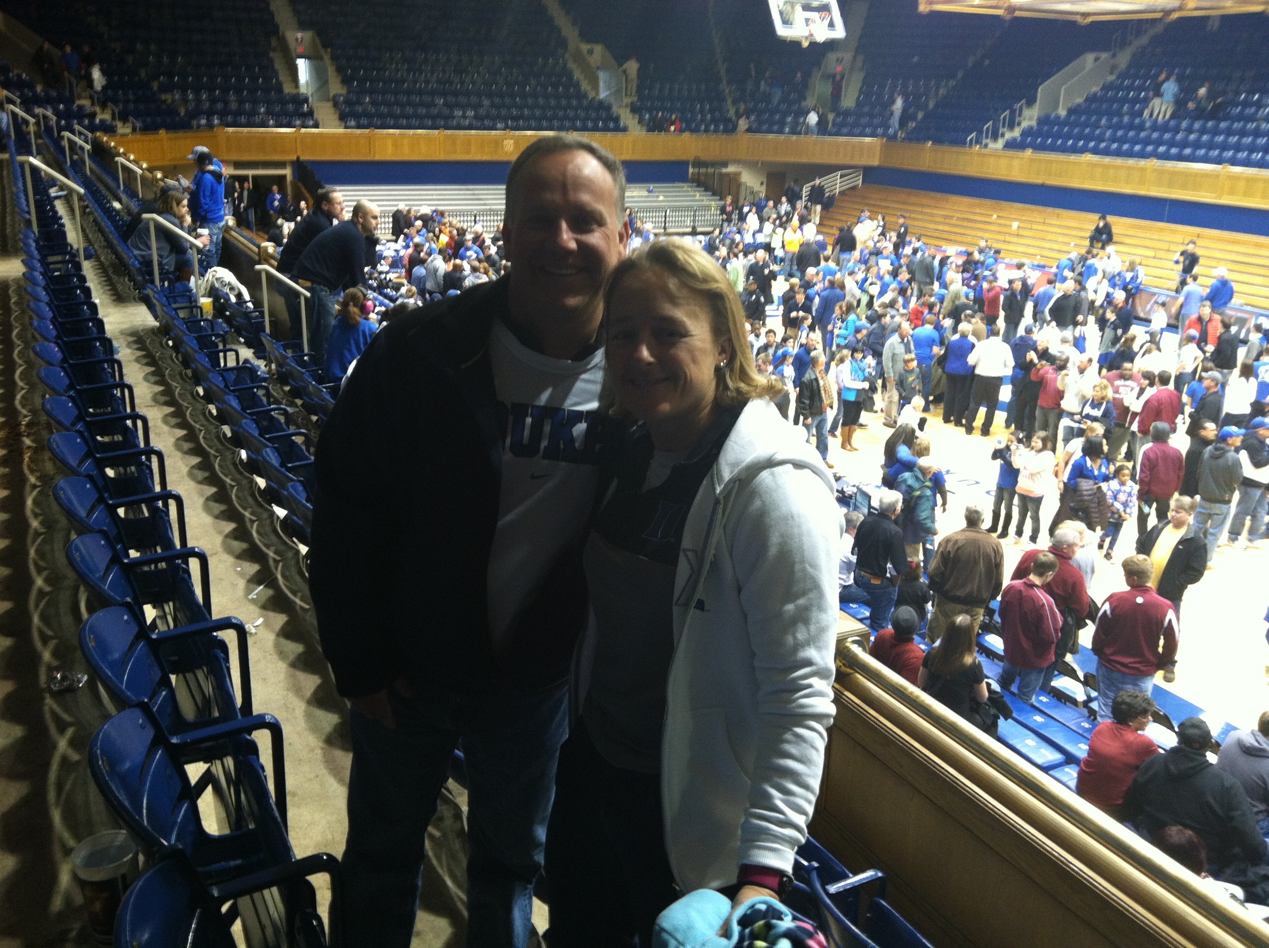 Our seats…….gates only open 1 hr prior & my main objective was to see it all! You have to climb the stairs to get to the main concourse and after making a loop to see all the memorabilia from past legends, we still couldn’t find our seats. Hmmmm. One more loop than I asked an usher. “You are downstairs”. Hmmmm. Another usher confirmed – “yeah just walk on the court in front of the Duke bench & then you will just have to hop over the press box desk”. Speechless. One row behind the announcers at dead center court looking straight across at the Cameron Crazies and I cried the entire game of pure elation. I can only remember 2 times in my life so far that my tears were uncontrollable. One of the highlights of my life.
