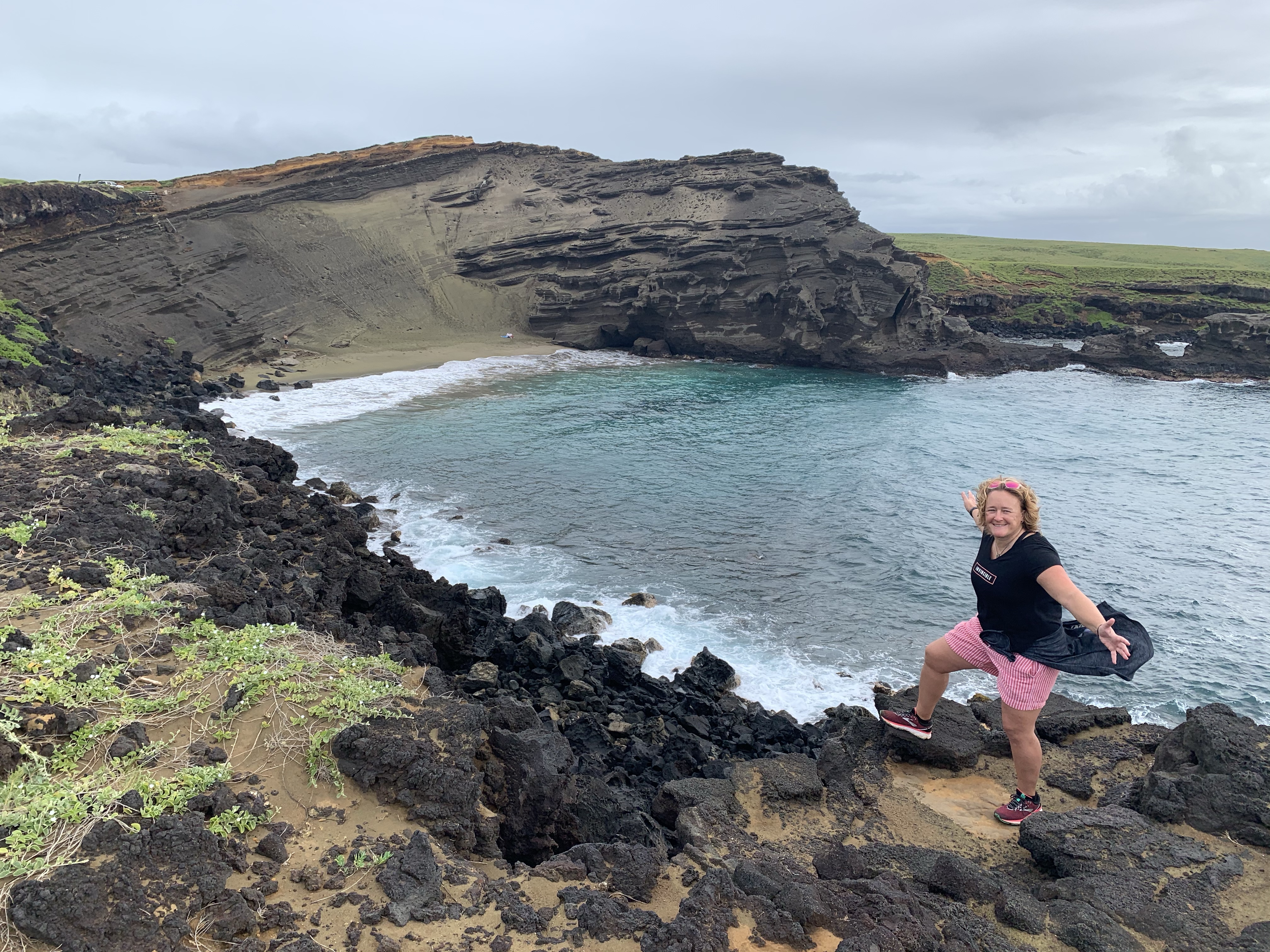 Luckily my phone GPS still worked and I could see my progress along the trail and knew I was getting close to this elusive beach. And suddenly along a dramatic cliffside, I got my first look at the green sands. The sharp lava rocks are no joke to traverse so I took my time climbing down. The access point is via a mini slot canyon and adds to the excitement. And sure enough, the sand had a green tint tucked into a beautiful bay between towering cliffs.