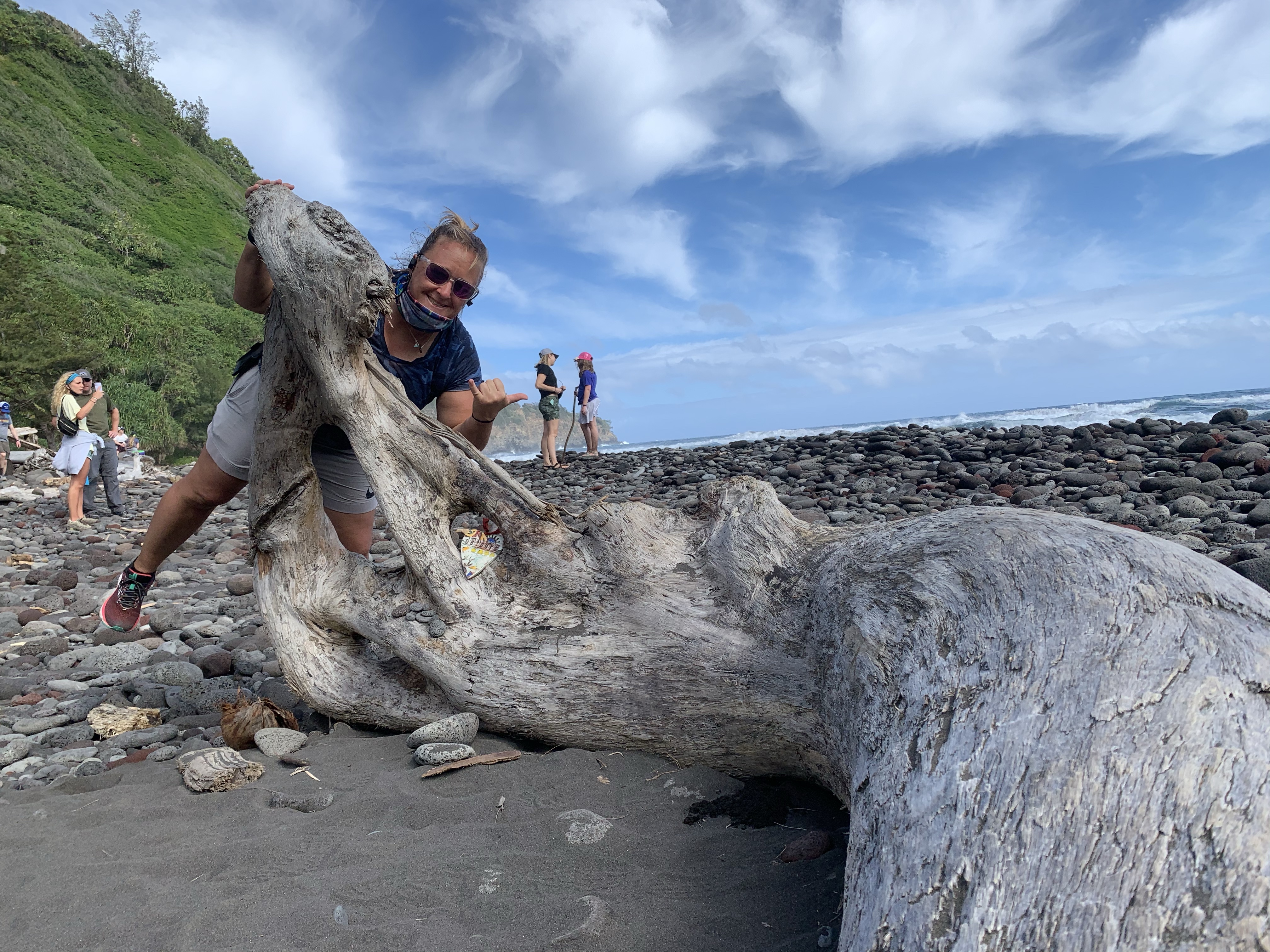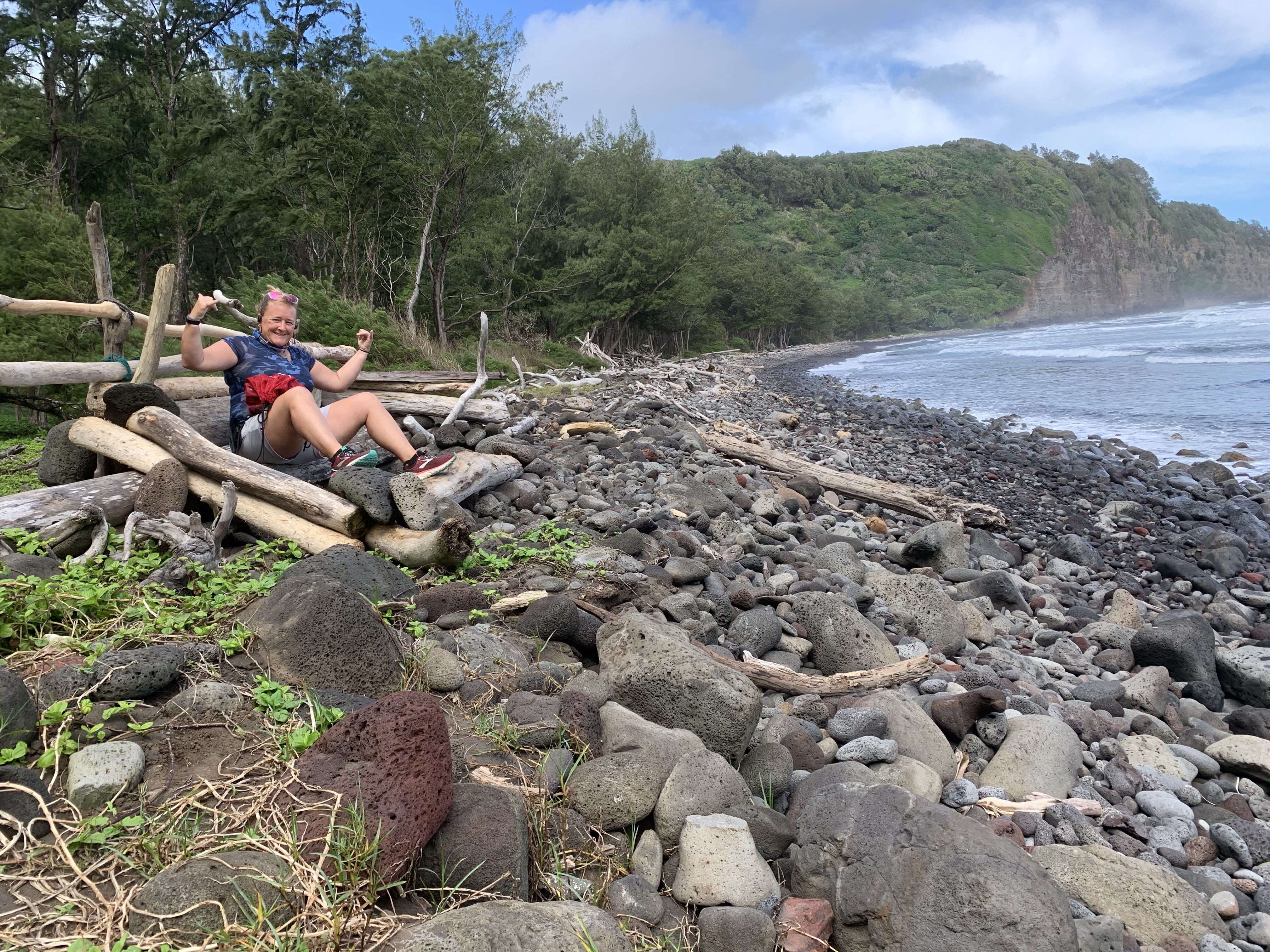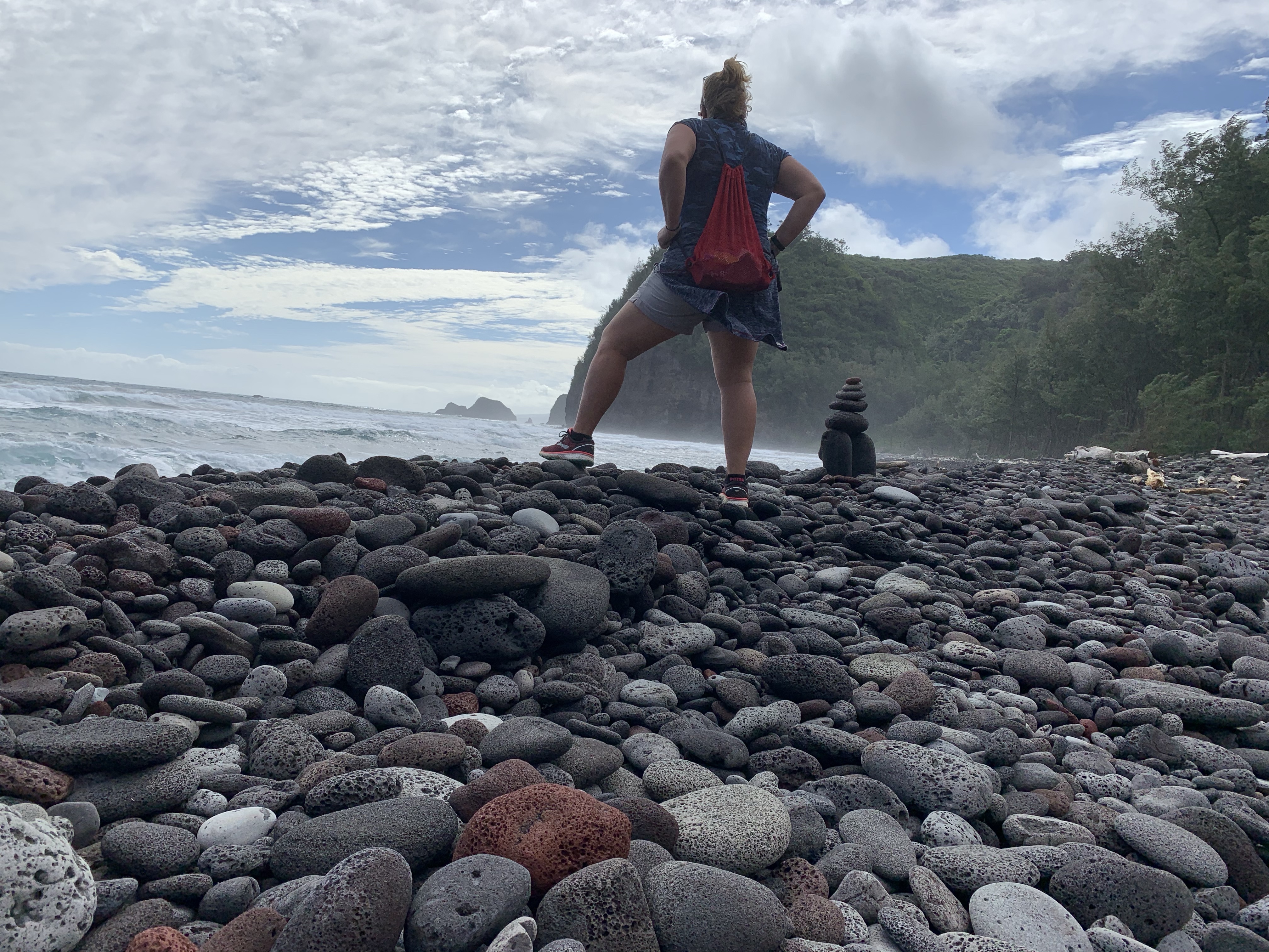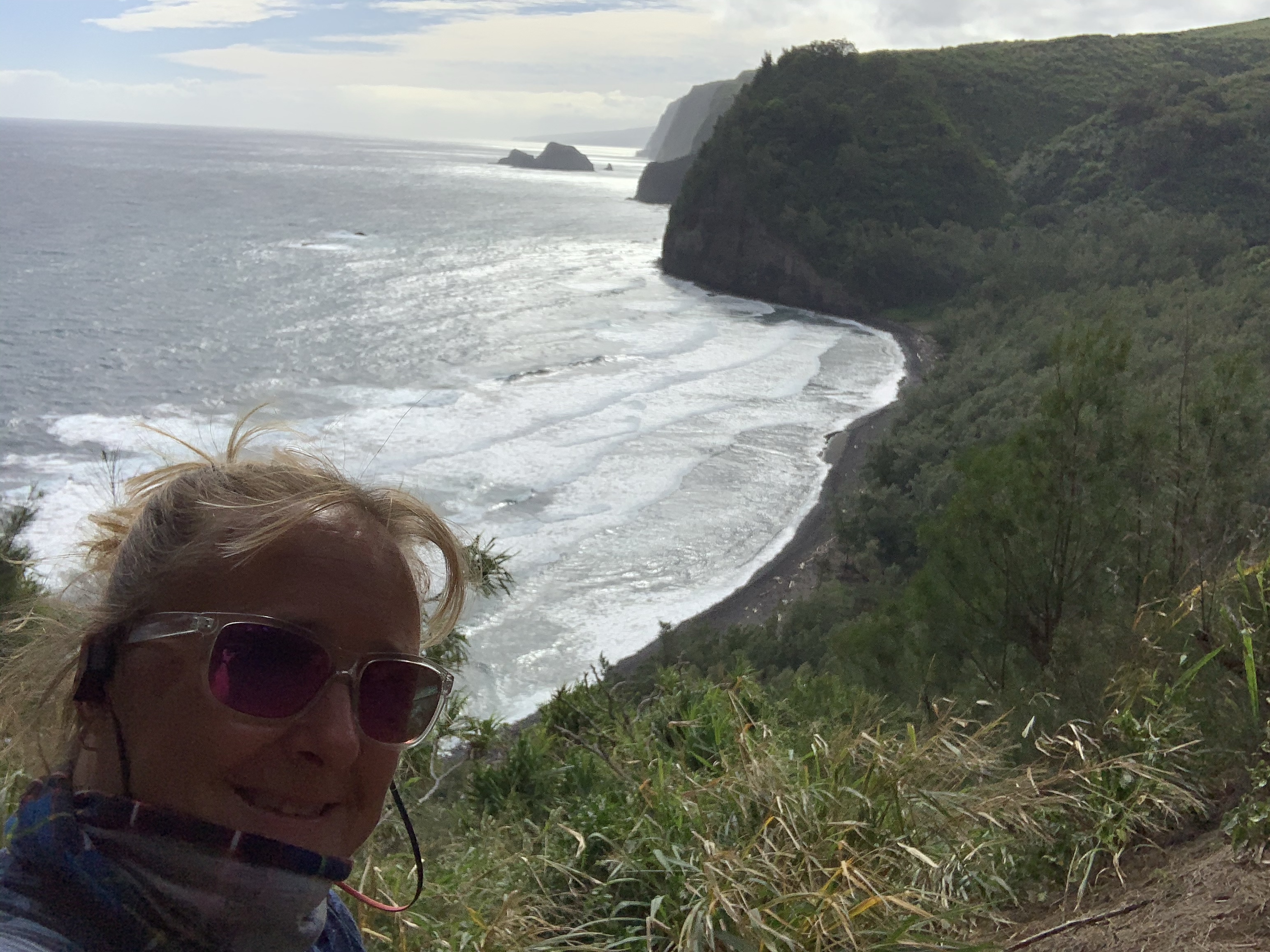 I woke so excited to go exploring at 6:30am with the sounds of the waves crashing along shore just 1 block away & the wild roosters making a ruckus with the light of a new day. My 2nd stop took me to just past the northernmost lookout point on the Big Island of Hawaii – Pololu Valley & the 1 mi steep descent to the black sand beach below. The violent waves crashed ashore BUT there was an indescribable feeling of peace radiating in the crisp Feb air.