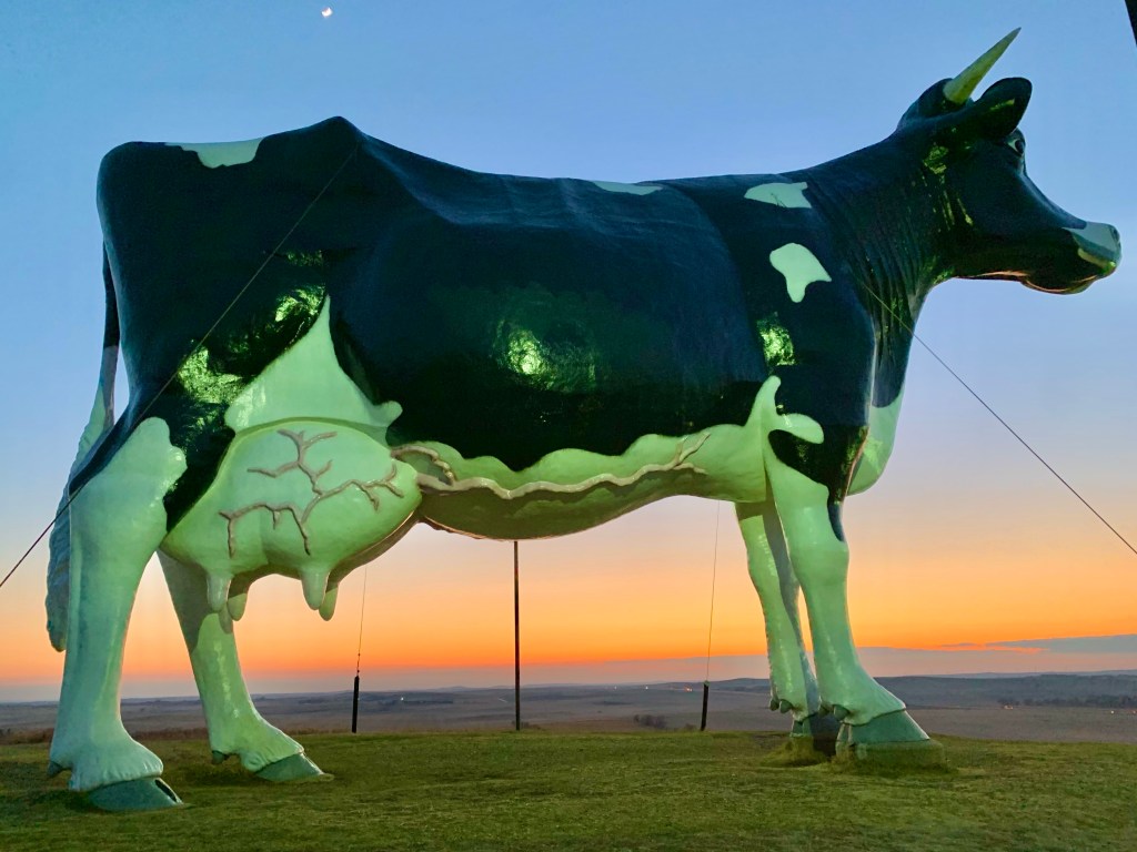 Sue is the largest Holstein cow in the world at 38β tall x 50β long x 12k lbs. She was erected in 1974 at $40k to pay tribute to the local hard working dairy farmers. I was the sole visitor that got to witness the late horizon glow and revel in the quiet expanse below. Quirky….. yes. A once in a lifetime tourist stop…… absolutely!