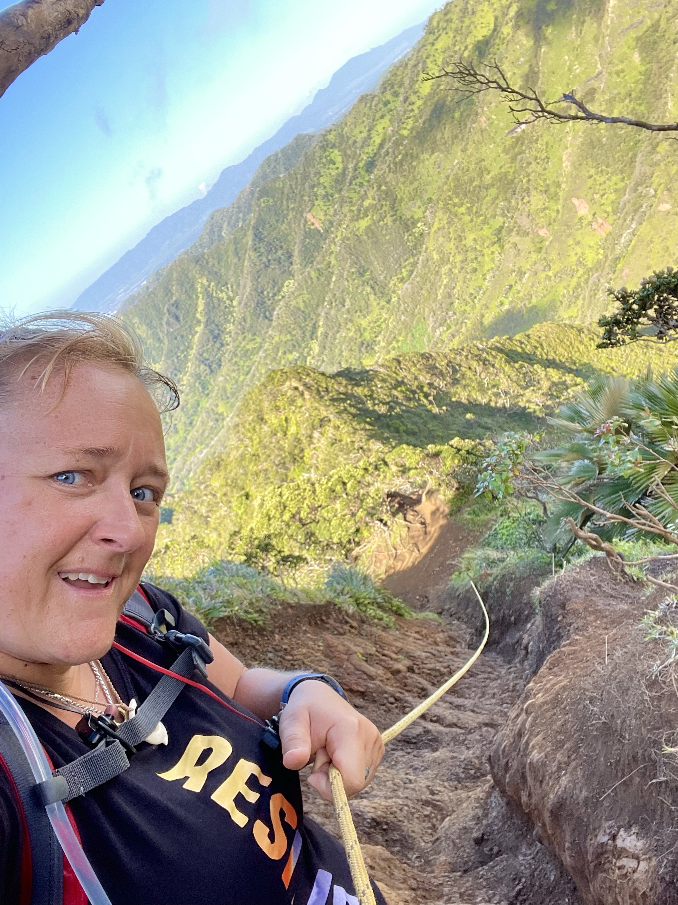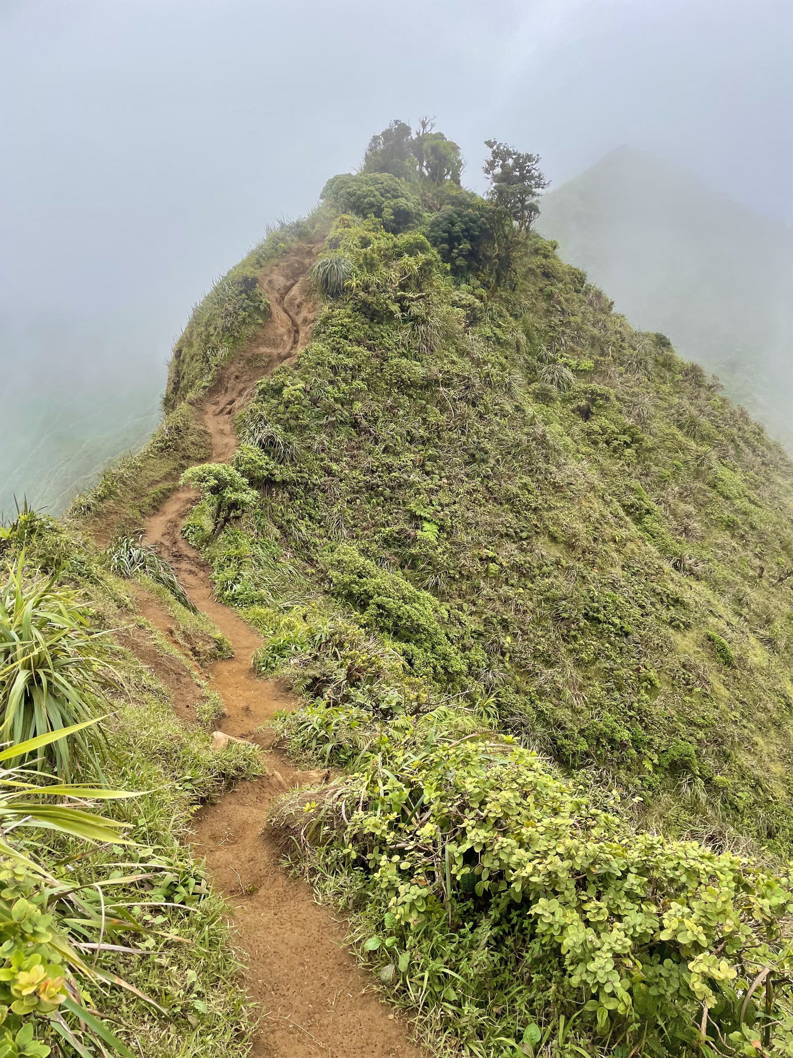 You dig in mentally for 3 hours straight uphill following RIDICULOUSLY narrow ridge lines amongst the quickly moving fog blankets hovering all around. Those two nearly vertical miles seem to inch on for ages, as you reach five different ledges that are so slick that ropes are dangling from branches to assist with your ascent. What did I sign up for? In this moment, I’m super thankful I didn’t drag any of my friends to this “gut check” trail as any fear of heights would have been paralyzing. Definitely a GDC moment!