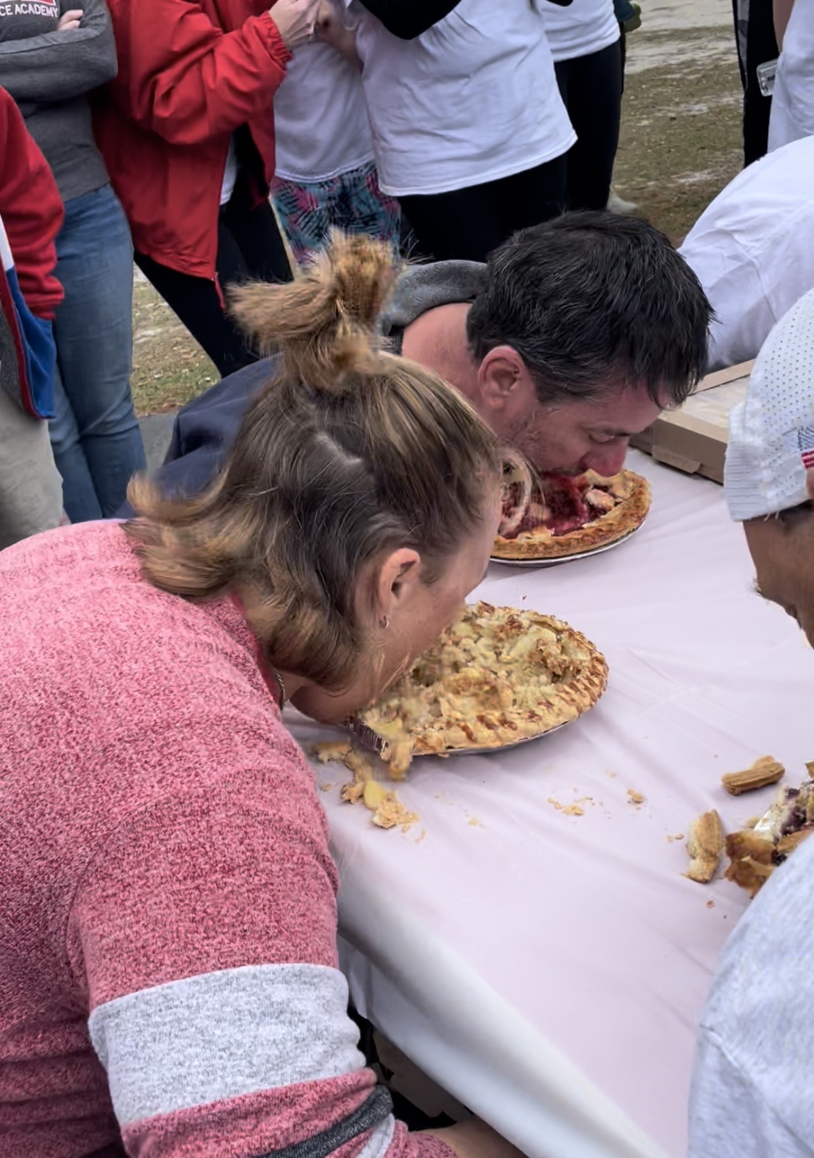 Bracing my hands on the table legs and pulling up my hair, I was ready for my attempt at greatness. I dove in, chomping away at my tray of Dutch Carmel apple (which at least boasted an inkling of tastiness in the crumb crust). Every muscle in my body contracted in pushing down my gag reflex (barely) and the next 4 minutes was a blur…. EXCEPT the sounds of Olivia screaming at me to keep going & that I was winning!! Her enthusiasm egged me on & I felt a second wind coming on.
