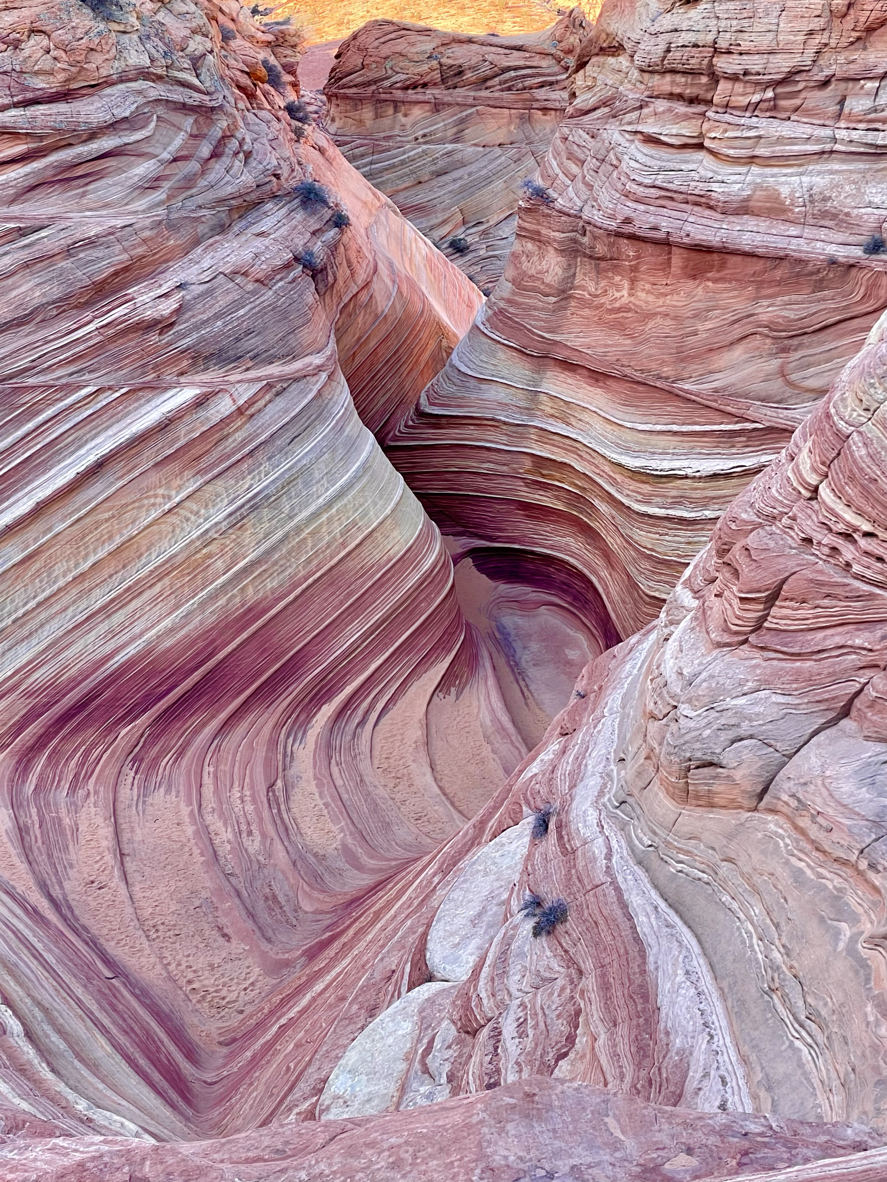 And thenβ¦β¦ The Wave, in all its glory, is still hidden from the sunβs rays and beaming to be explored. I went crazy snapping pics and videos, even having enough signal to shoot a live video! I certainly didnβt take this solitude for granted, as I knew it couldnβt last for long. But after an hour of jumping around alone, I ventured upward to climb to even more lookouts and peer into numerous different coves. It was so rejuvenating and life changing, even after tripping over a boulder to slice off the top of my finger. (My first aid kit came in very handy).
