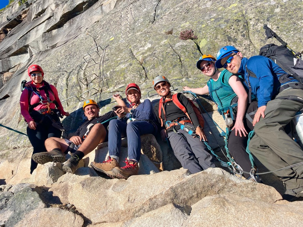 We snacked while admiring the picture perfect bay below, being intimidated by the looming steps above and strapping on our climbing gear. After the obligatory group starting photo, our 8 brave adventurers clipped in for 3 hours of intense focus.