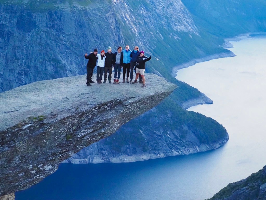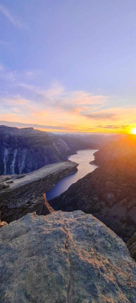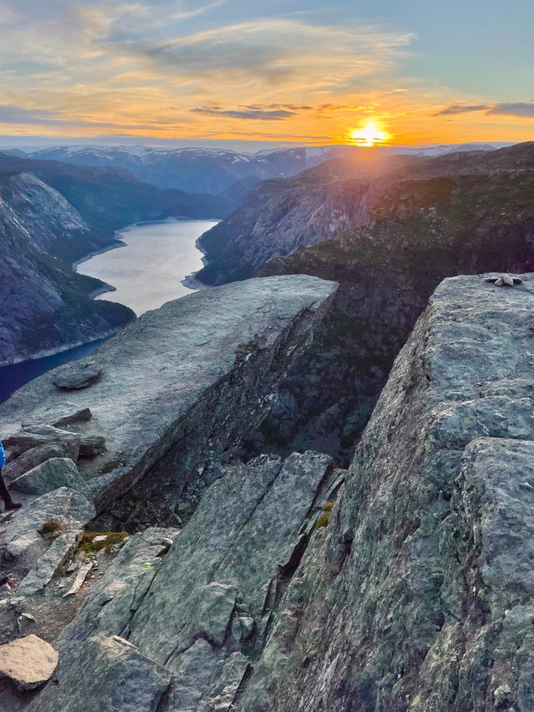 As we crested over the last ridge, the elusive Trolltunga was glowing in the last rays of sunlight. It was majestic and surrealβ¦. one of those moments cemented in my brain for eternity!