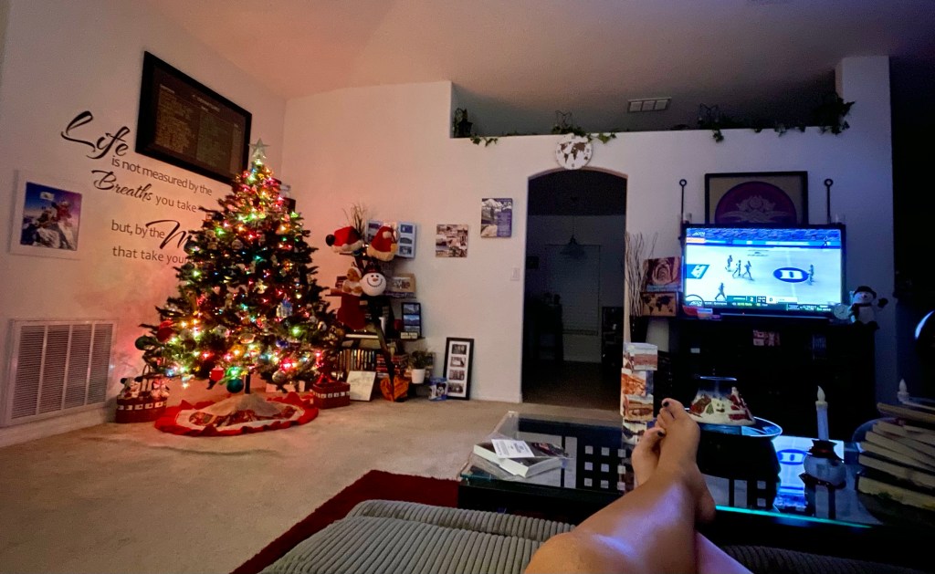 So my winning combo is showcasing the start of college basketball season on my big screen, light up a few seasonal candles, heat up a quick dinner and tackle the onslaught of pine needles flaking off all the smashed tree limbs that are screaming to awaken. I inevitably get frustrated with finding the non-labeled branches and end up just haphazardly draping the four strands of lights after a few hours. I dive into original boxes of keepsake Hallmark ornaments, which are never ending and half of which donโt get used once again.