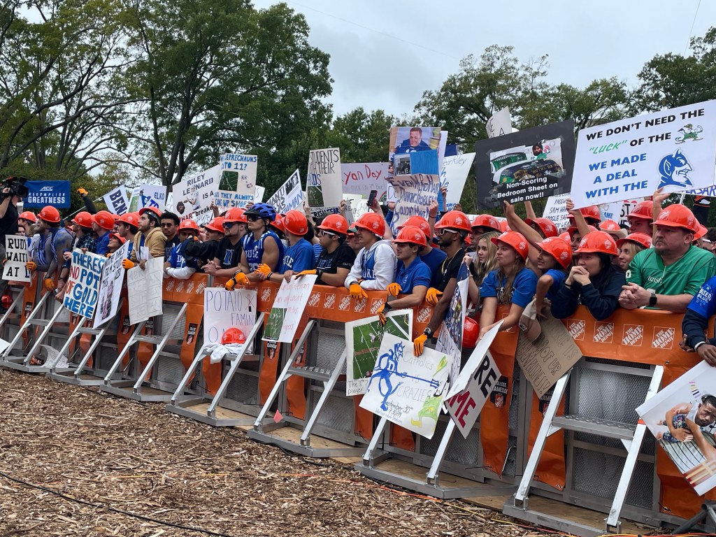 We pulled into a baron parking lot and made the half mile walk to the campus hub to find hundreds of blue devil crazies already piled into a mosh pit in front of the main stage. So we post up just to the left of the main stage.