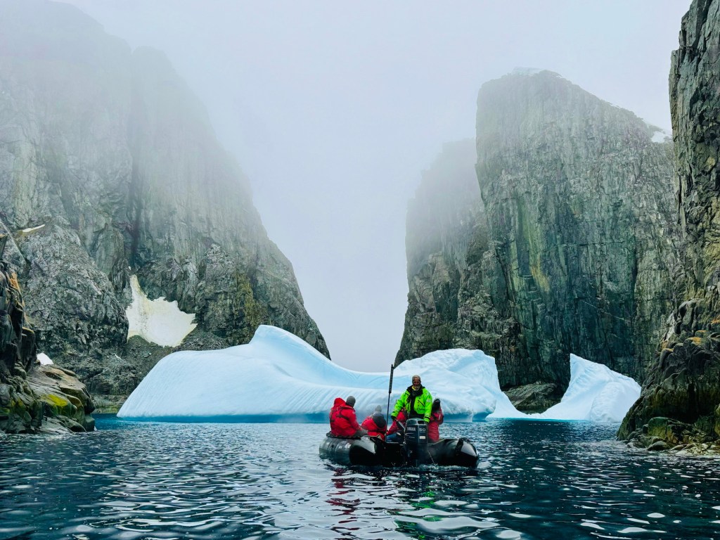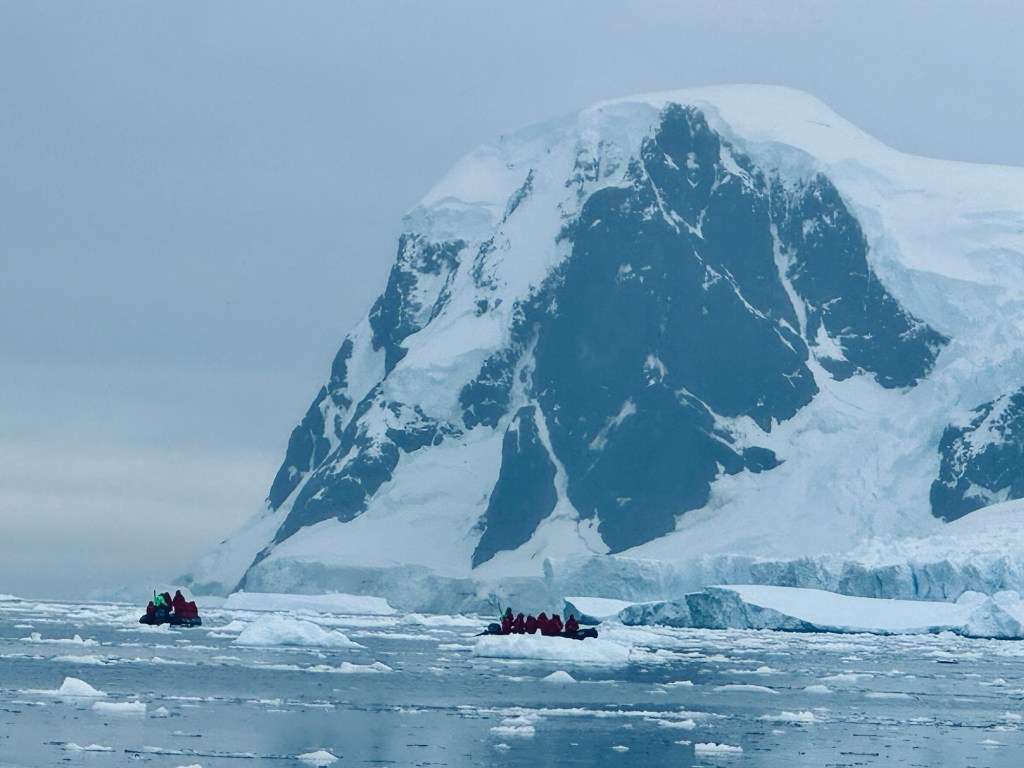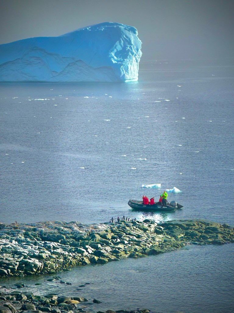 After fully layering up with 4 layers on the top and 3 on the bottom, you get funneled through the prep station to swipe your card, walk through a vat of pink disinfectant water, get checked by a staff person and then step off the gangway into the waiting zodiac boats that are your extension to the harsh landscapes in this polar region.